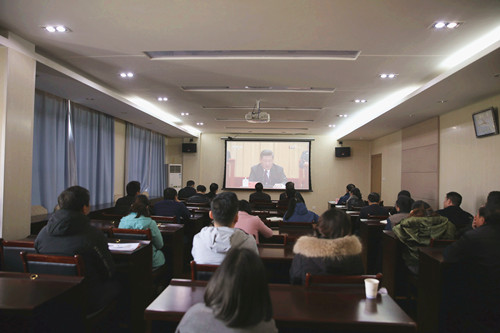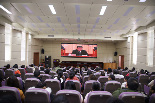在行政楼第一会议室,学院党委书记潘晓华,党委副书记、院长秦夏明,党委委员、副院长肖鸿晶、熊运儿,以及行政机关人员共同观看了大会盛况,聆听了习近平总书记重要讲话。在第一教学楼学术报告厅,各系(部)教师和学生认真观看了大会盛况。