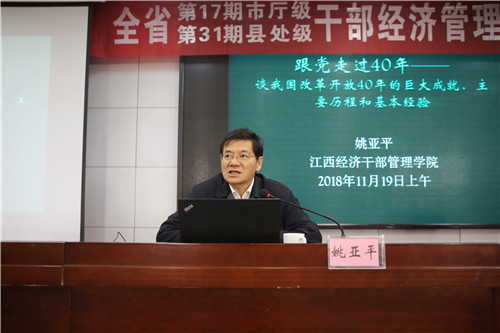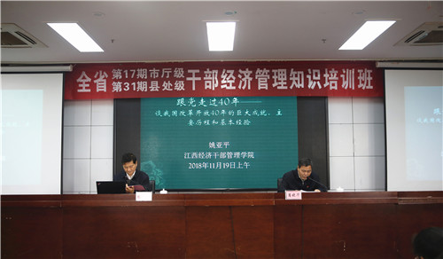 11月19日上午,学院在培训楼二楼报告厅举行改革开放40周年主题宣讲会,特邀原江西省委常委、宣传部部长,原江西省政协党组副书记、副主席姚亚平教授来院作宣讲报告。学院党委书记潘晓华,党委委员、副院长衷敬华、肖鸿晶,全体处级干部,以及全省第17期市厅级暨第31期县处级领导干部经济管理知识培训班全体学员共150余人聆听宣讲。潘晓华主持宣讲会。