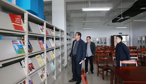 潘晓华一行在图书馆负责人的陪同下,详细了解党建读物和党的十九大精神专区建设情况,实地查看了教工阅览室、期刊阅览室、学生自习室,并与学生和图书馆管理人员进行交流。
