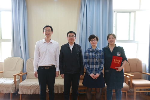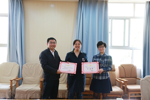 梁磊和蔡萌萌代表九三学社省委会向九三学社社员、学院会计系教师张萍颁发了“2016--2017年度全省先进个人”及“九三学社‘十一大’精神征文活动三等奖”荣誉证书。