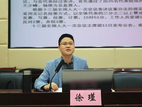 4月12日下午,学院党委书记潘晓华主持召开2018年第3次党委中心组(扩大)学习会。本次学习会邀请了江西农业大学人文与公共管理学院法学系主任徐瑾来院解读《中华人民共和国宪法修正案》。学院党委副书记、院长秦夏明,党委委员、副院长衷敬华、肖鸿晶、熊运儿,以及副处级及以上领导干部参加学习会。