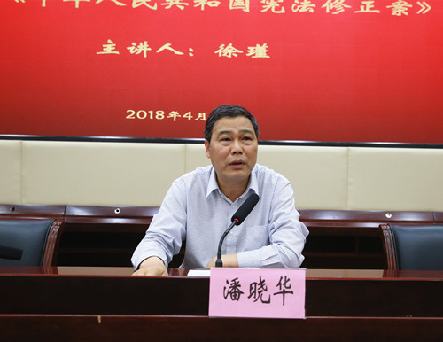 潘晓华在讲话中指出,宪法是国家的根本法,是治国安邦的总章程,具有最高的法律地位、法律权威、法律效力,具有根本性、全局性、稳定性、长期性。任何组织或者个人,都不得有超越宪法和法律的特权。十三届全国人大一次会议通过的宪法修正案,与时俱进地体现了党的主张、国家意志和人民意愿的有机统一,就新时代如何坚持和发展中国特色社会主义、实现“两个一百年”奋斗目标和中华民族伟大复兴中国梦,以根本法的形式给出了答案。