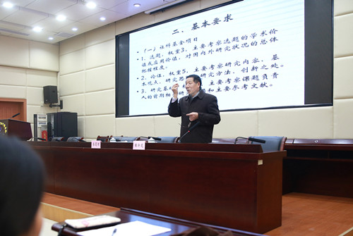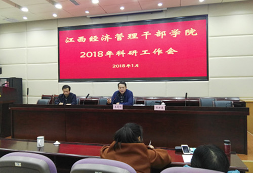 为进一步加强学院科研工作,推进新型智库建设,提升核心竞争力,1月18日下午,学院在一教学术报告厅召开科研工作会,全面总结2017年科研工作、研究部署2018年科研工作,邀请省内专家、南昌大学黄新建教授作国家社科基金项目申报的专题辅导。学院党委副书记、院长秦夏明,党委委员、副院长肖鸿晶,各系(部)正、副主任,院级研究所正、副所长,各系(部)研究所正、副所长,副高级职称以上人员,全体博士,科研处、省级科研平台全体人员,部门和系(部)科研骨干代表参加会议。会议由肖鸿晶主持。