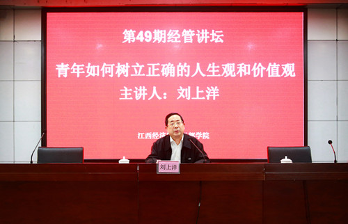10月16日下午,学院在培训中心二楼会议室举行第49期经管讲坛。本次讲坛邀请了全国政协委员,江西省文化产业促进会会长,江西省思想政治理论课特聘教授,原江西省委常委、省委宣传部部长,原江西省政协党组副书记、副主席刘上洋来院,他以《青年如何树立正确的人生观和价值观》为题为师生上了一堂精彩的思政课。党委书记潘晓华,党委委员、副院长林蓉,各系团总支、辅导员老师及学生代表共200余人聆听了讲课。