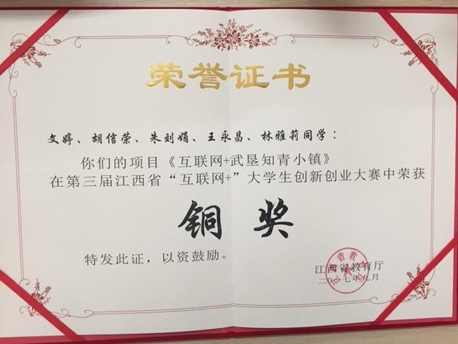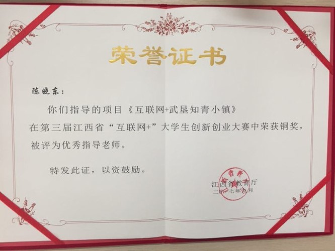近日获悉,第三届江西省“互联网+”大学生创新创业大赛中,学院选送的“互联网+武垦知青小镇”创新创业项目获得铜奖,陈晓东获“优秀指导老师”。