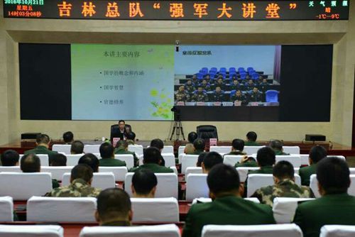 10月21日下午,副院长衷敬华应邀赴吉林武警总队,在“强军大讲堂”为两级机关作《国学智慧与官德修养》的辅导授课。总队司令员黄炎海、副司令员耿新东等在家常委参加了听课。总队副政委章平根主持讲学。此次授课共设1个主会场、13个分会场,共计600余人聆听了讲课。