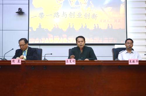 27日下午3点30,学院在二教视频会议中心举行“一带一路与创业创新”的学术讲座。学院校友、海南中海国际经济合作有限公司董事长周晨先生为“一带一路与创新创业”讲座的主讲者。出席讲座的有学院院长秦夏明、副院长衷敬华,以及老同志代表、各系(部)老师和学生代表。讲座由衷敬华主持。