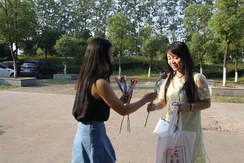 院学生会主席熊蕊接受采访时说:“老师为我们传道、授业、解惑,我们要不忘师恩,在这特别的节日里,我们用鲜花表达对老师们的爱和敬意。”14级工商系李杰同学说:“很开心自己能参与这次活动,为老师献上美丽的鲜花,对老师真诚的说一句谢谢,感谢老师这一年的陪伴和教导。” 冯飞燕/文