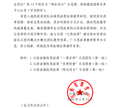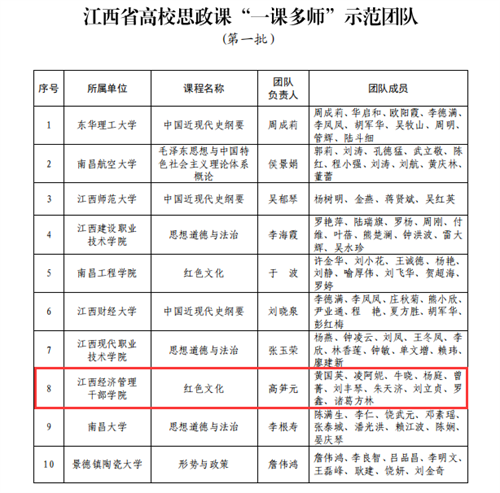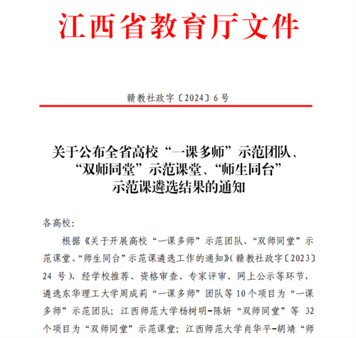 近日,江西省教育厅印发了《关于公布全省高校“一课多师”示范团队、“双师同堂”示范课堂、“师生同台”示范课遴选结果的通知》,学校马克思主义学院联合文法学院及校内外师资,依托《红色文化》课程打造的“一课多师”教学团队,荣获江西省高校“一课多师”示范团队,全省仅有10所高校的团队获此殊荣,我们学校就是其中之一。