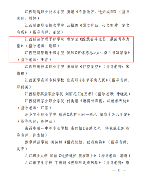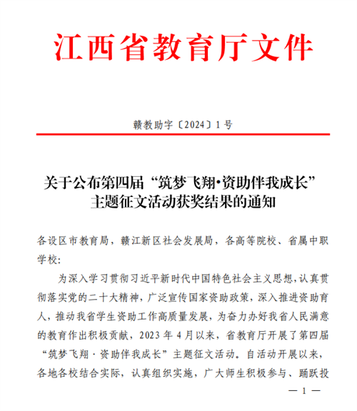 近日,省教育厅发布《关于公布第四届 "筑梦飞翔 资助伴我成长"主题征文活动获奖结果的通知》(赣教助字〔2024〕1号,电子与信息工程学院曹梦莹《绽放奋斗光芒,激荡青春力量》(指导教师:谢琛)、航空运动学院陈凤《常怀感恩之心,奋斗书写华章》(指导教师:王言)分别荣获三等奖。