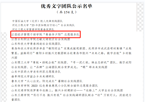 近日,由共青团中央青年发展部、中国青年报、中国青年网共同举办的2023年全国大中专学生志愿者暑期文化科技卫生“三下乡”社会实践“镜头中的三下乡”征集活动遴选结果公布,学校衷欣、李晓蓉、周园园老师指导的“青春伴夕阳”志愿服务队经报名审核、作品发布、网络展示、综合评审等环节,最终荣获“优秀文字团队”称号。据悉,全国共遴选出154支“优秀文字团队”。