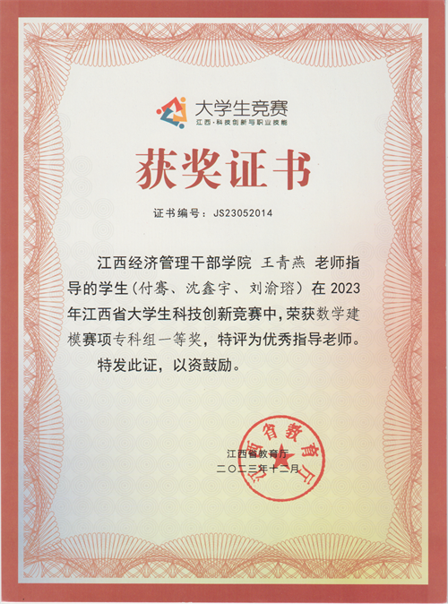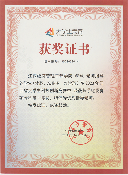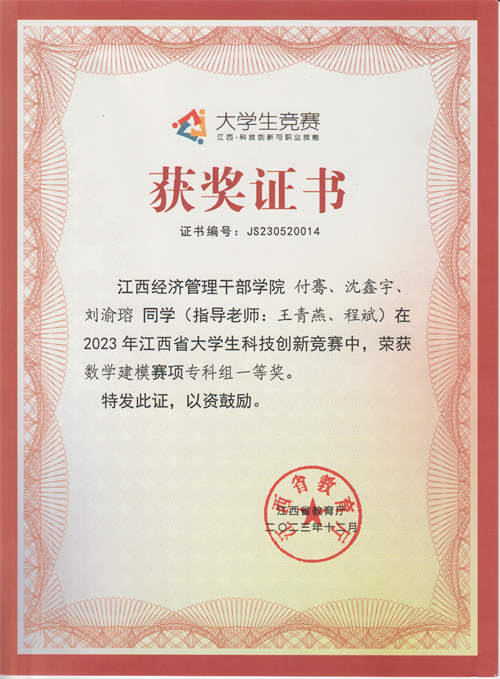 近日,江西省教育厅公布了2023年江西省大学生科技创新竞赛获奖结果,我校付骞、沈鑫宇、刘渝瑢三位学生荣获2023年江西省大学生数学建模竞赛一等奖,王青燕、程斌两位指导教师被评为“优秀指导老师”。