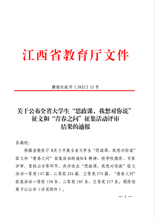近日,省教育厅公布全省大学生“思政课,我想对你说”征文和“青春之问”征集活动评审结果,我校获得一等奖1项,二等奖4项,三等奖7项。