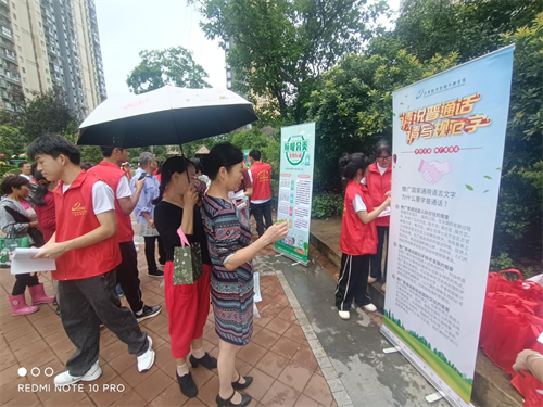 为推进国家通用语言文字的普及推广,调查地区居民普通话使用情况,志愿服务队开展国家通用语言使用情况调研社会实践。队员们通过发放问卷、实地走访开展调查研究。队员们通过发放推普宣传单等学习材料,开展“普通话”推广培训活动,组织推普有奖竞答,大力推进说普通话、写规范字的宣传教育活动,切实把大力推广普通话落到实处。