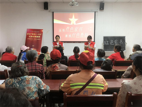志愿服务队为新时代文明实践站居民声情并茂地诵读红色家书。方志敏、夏明翰、左权情深意切、鲜活生动的家书蕴含着血雨腥风的年代下醇厚的热望与期待,一个个不惜牺牲生命的奋斗故事,犹如一段段波澜壮阔的革命史诗,让社区居民穿越时空,见证历史,体验最真实的英烈故事,感悟最真切的信仰力量,现场不时响起被诵读者情绪感染而发的热烈掌声。