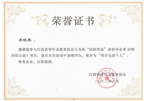 近日,学校团委承办江西省青年志愿者协会“回新转益”高校毕业季旧物回收公益项目,李晓蓉老师被评为“项目先进个人”。
