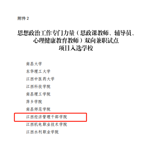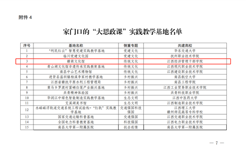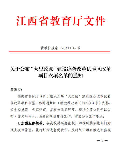 近日,江西省教育厅公布了“大思政课”建设综合改革试验区改革项目立项名单,我校文法学院院长林芸负责的“赣商文化馆”获批家门口的“大思政课”实践教学基地;学生工作处副处长陈磊负责的“思政课教师、辅导员、心理健康教育教师三支队伍融合培养”获批“思想政治工作专门力量双向兼职试点项目”。