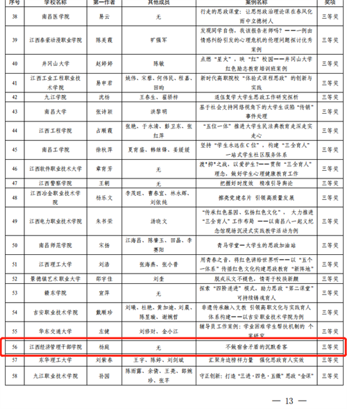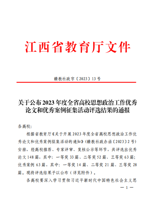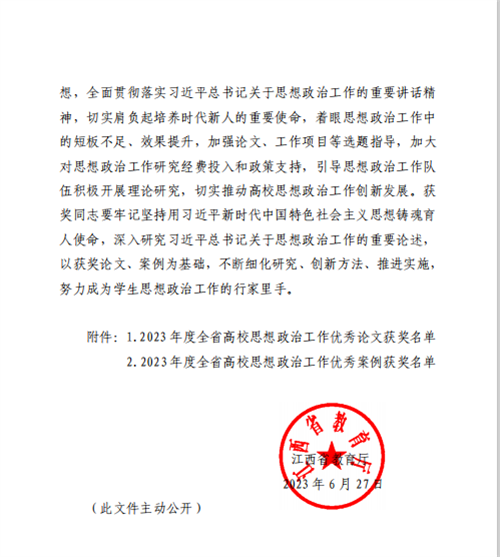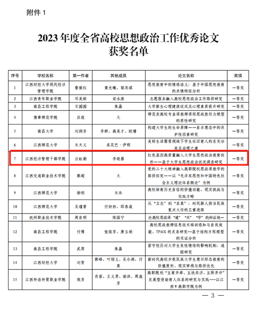 近日,省教育厅公布2023年度全省高校思想政治工作优秀论文和优秀案例征集活动评选结果,我校汪虹韵、李晓蓉老师的《红色基因高质量融入大学生思想政治教育探析——基于大学生思想政治状况调查研究》获得全省高校思想政治工作优秀论文一等奖,杨庭老师的《不做宿舍矛盾的沉默看客》获得全省高校思想政治工作优秀案例三等奖。