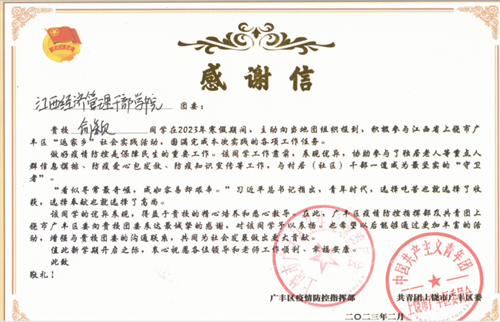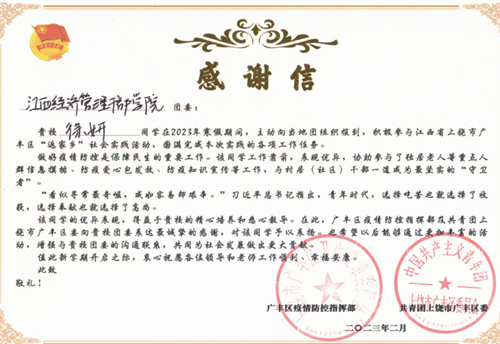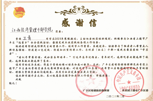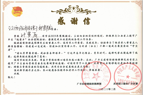 近日,共青团上饶市广丰区委员会发来多封感谢信,对寒假期间参加“返家乡”社会实践的4位同学予以表扬,同时向学校共青团表示感谢。