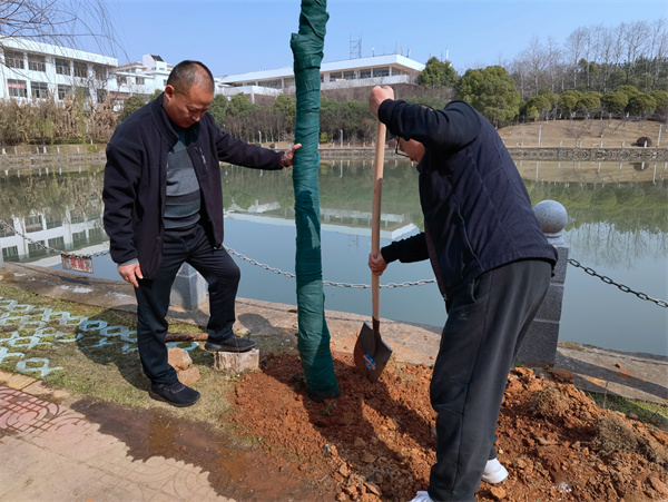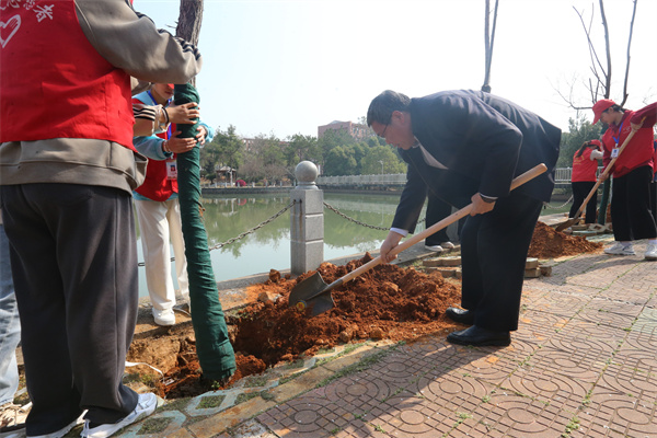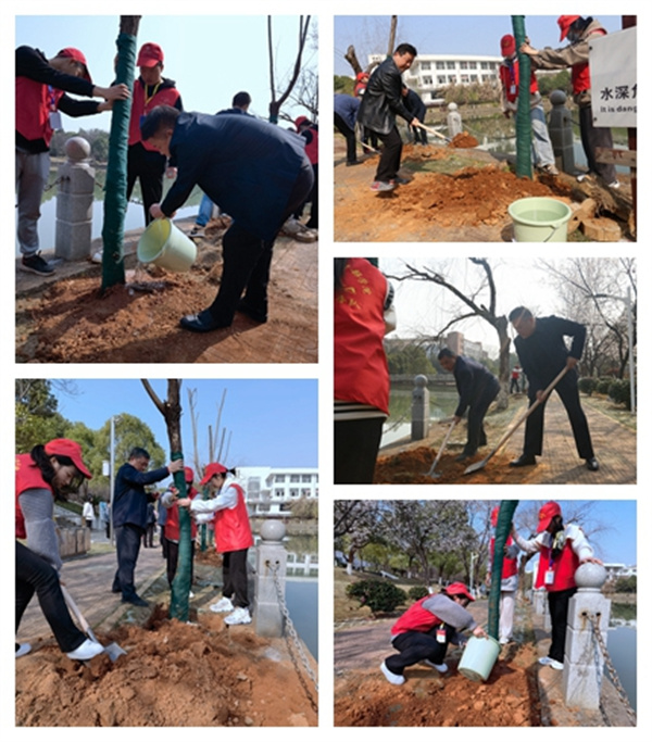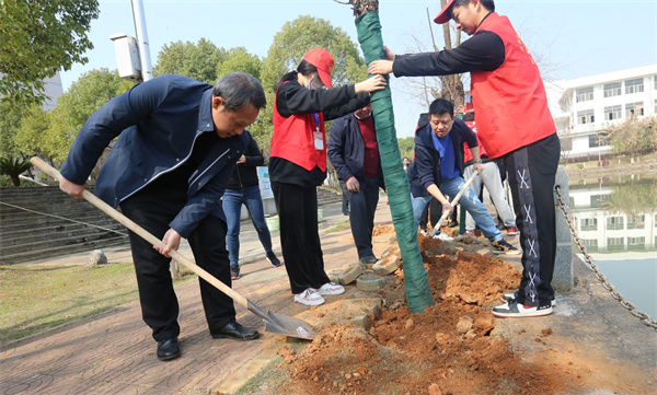 春光明媚,万物复苏。在第45个植树节来临之际,为贯彻落实习近平生态文明思想,增强师生绿色低碳环保意识,共建绿色校园,3月7日,学校组织师生开展义务植树活动。党委书记潘晓华,党委副书记、校长秦夏明,党委委员、副校长肖鸿晶、熊运儿,部分机关工作人员、学生代表参加植树活动。