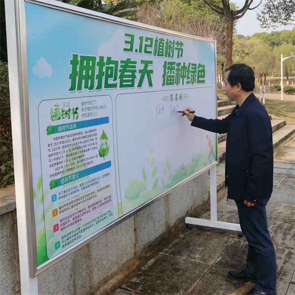 在植树现场,校领导带领参与植树的师生分工协作,一起挥锹铲土、扶植苗木、培土压实、浇水灌溉。大家还纷纷在绿化倡议书签名板上留下自己的签名。卧龙湖畔,盈盈垂柳,自成一派怡人风景。