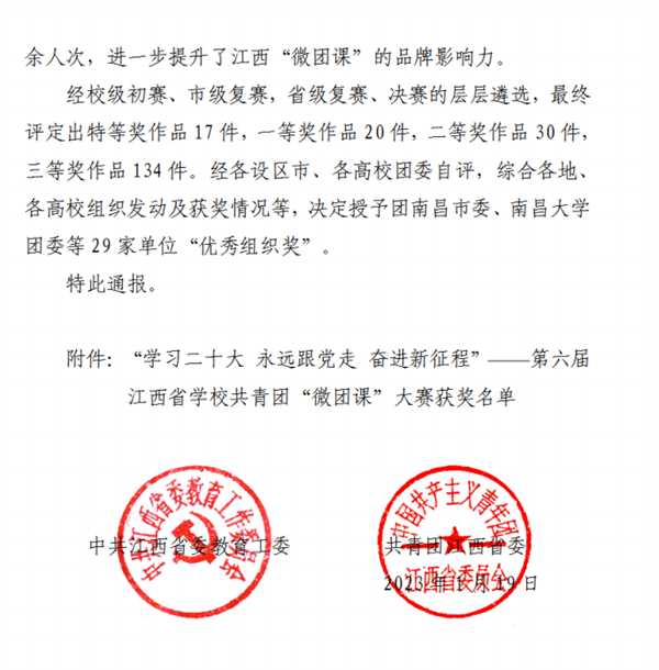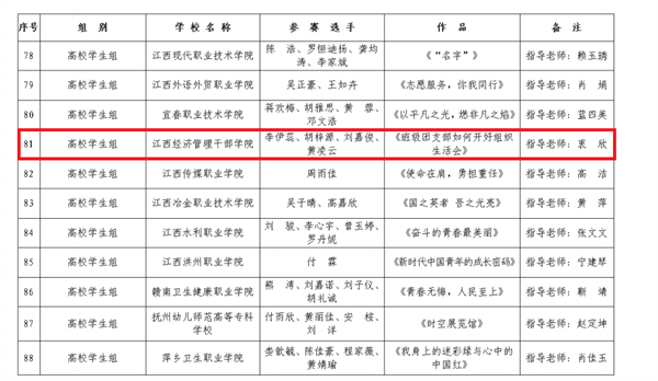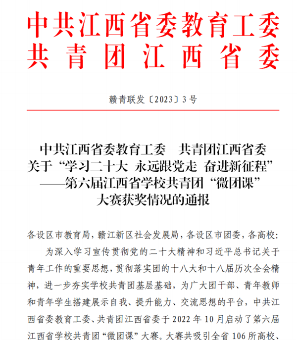 近期“学习二十大,永远跟党走,奋进新征程”——第六届江西省学校共青团“微团课”大赛结果公布,学校参赛作品《班级团支部如何开好组织生活会》荣获学生组三等奖。