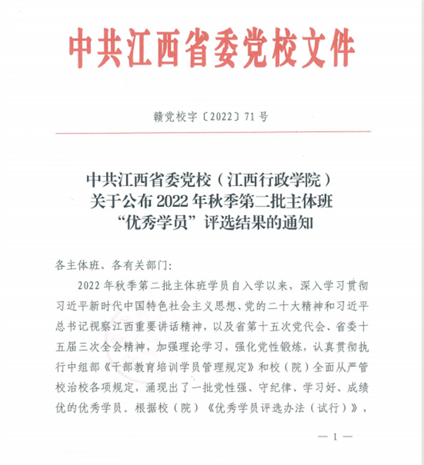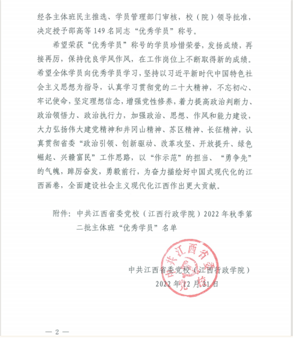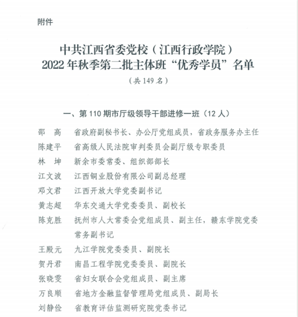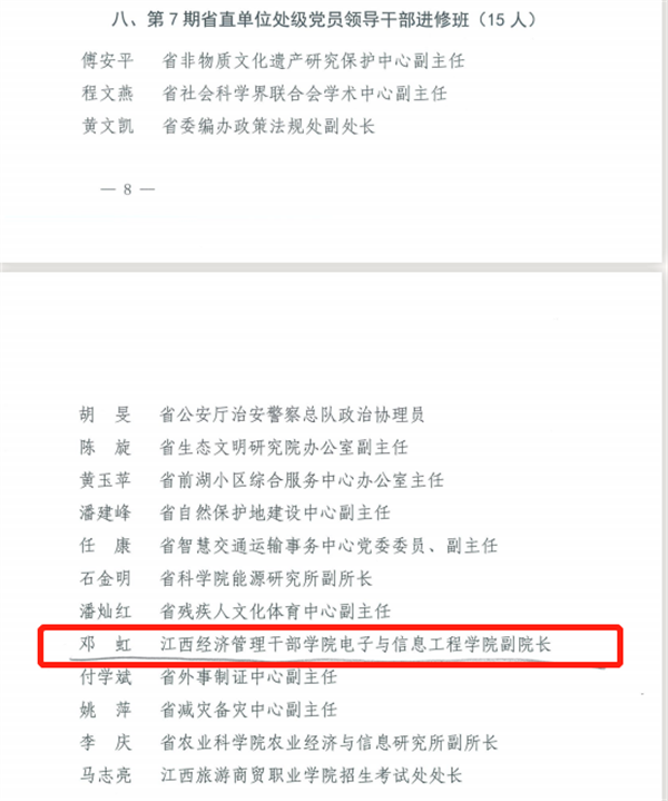 根据《中共江西省委党校(江西行政学院)关于公布2022年秋季第二批主体班“优秀学员”评选结果的通知》,学校电子与信息工程学院副院长邓虹同志获评第7期省直单位处级党员领导干部进修班“优秀学员”。
