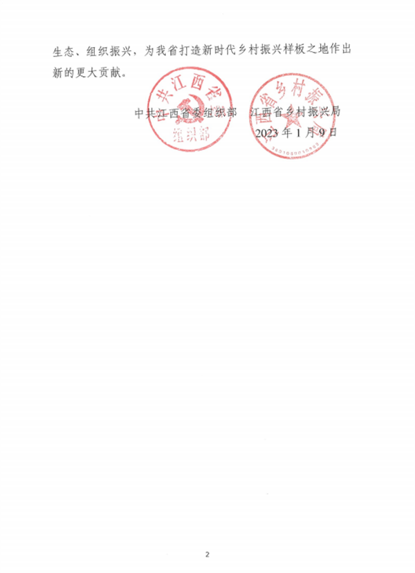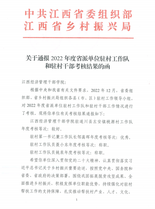 近日,中共江西省委组织部、江西省乡村振兴局通报了2022年度省派驻单位驻村工作队和驻村干部考核结果,学校驻遂川县左安镇桃源村工作队年度考核结果为“较好”,驻村第一书记兼工作队长邹嵩晖年度考核结果为“优秀”。