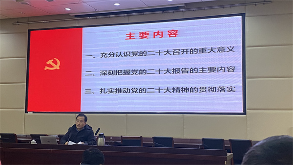 肖鸿晶围绕充分认识党的二十大召开的重大意义、深刻把握党的二十大报告的主要内容、扎实推动党的二十大精神的贯彻落实三个方面展开,通过“五个牢牢把握”全面阐述了党的二十大精神实质、过去五年的工作和新时代十年的伟大变革的重大意义、习近平新时代中国特色社会主义思想的世界观和方法论、以中国式现代化推进中华民族伟大复兴的使命任务、以伟大自我革命引领伟大社会革命的重要要求、团结奋斗的时代要求。他希望全体同志深刻领悟“两个确立”的决定性意义,增强“四个意识”、坚定“四个自信”、做到“两个维护”,认真学习领悟党的二十大报告中蕴含的新观点、新论断、新战略,做到学懂弄通、学深悟透,切实把思想和行动统一到党中央决策部署上来,把力量凝聚到实现党的二十大确定的各项任务上来,推动党的二十大精神深入人心、见行见效。