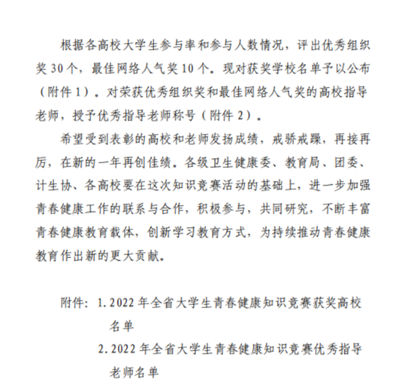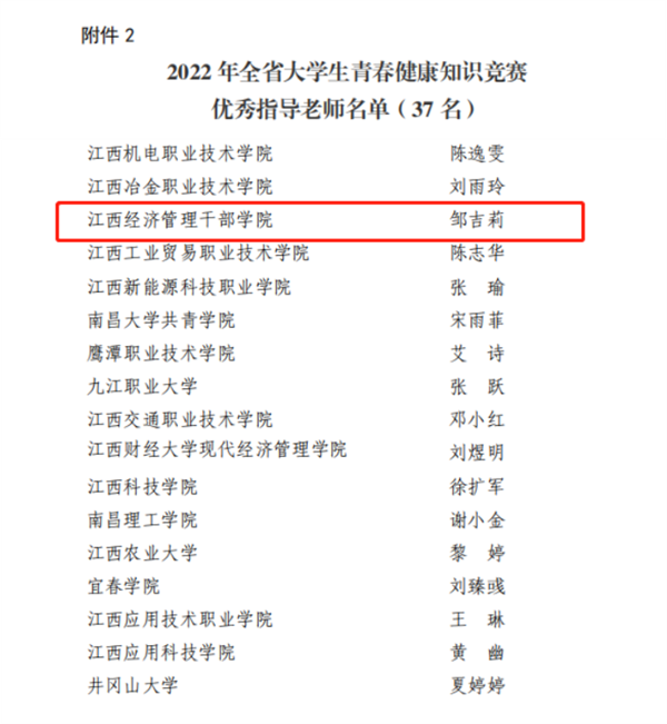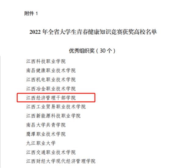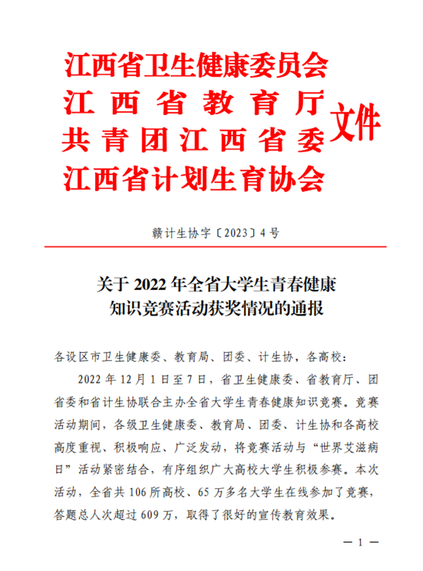近日,江西省卫生健康委员会、省教育厅等部门联合公布了全省大学生青春健康知识竞赛活动获奖情况,学校荣获“优秀组织奖”,总务处邹吉莉老师荣获“优秀指导老师”。