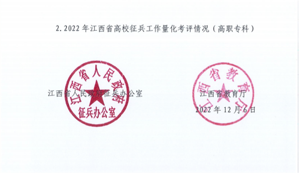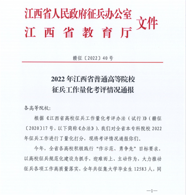 近日,省人民政府征兵办公室和省教育厅联合印发《2022年江西省普通高等院校征兵工作量化考评情况通报》,我校大学毕业生征兵任务完成率为253.57%,在全省本科院校排名第二。