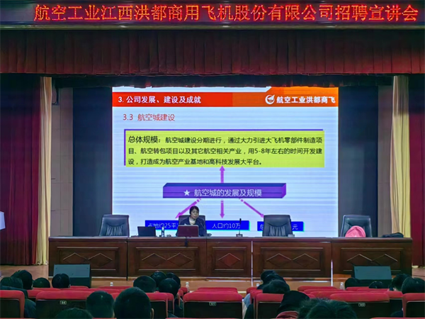 会议开始,洪都商飞人力资源部招聘专员范露化介绍了公司概况、公司成就、招聘条件、人才政策以及录用说明等。江西洪都商用飞机股份有限公司,注册资本12亿元,由中国航空工业集团公司控股,与江西省政府共同出资组建。主要经营范围为:国内、国际商用飞机大部件、零组件的设计、研制、生产、销售、维修及服务;航空产品的转包生产;航空科学技术开发、咨询、服务、引进和转让;相关航空产品开发、生产、销售;相关航空产品及原材料进出口等。