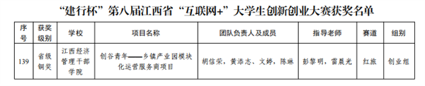 据悉,在“建行杯”第八届江西省“互联网+”大学生创新创业大赛中,我校胡信荣,黄添志、文婷,陈琳团队项目“创谷青年——乡镇产业园模块化运营服务商项目”(指导老师:彭黎明,雷晨光)获省级铜奖。