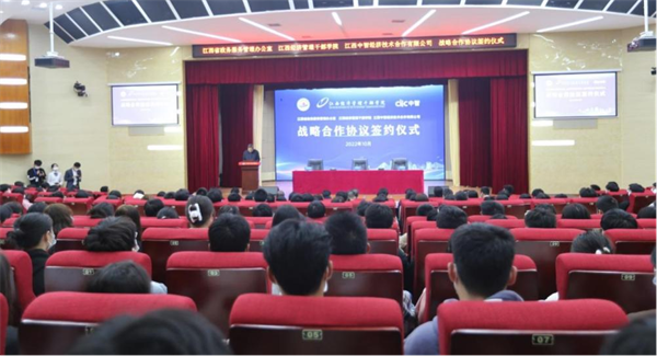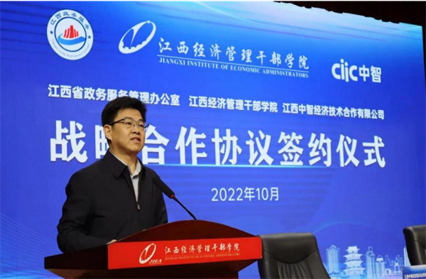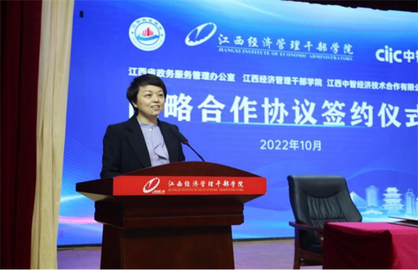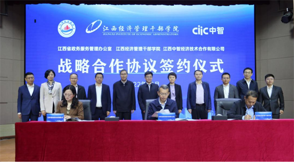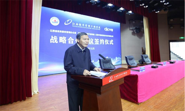 10月28日,江西省政务服务办公室、江西经济管理干部学院、江西中智经济技术合作有限公司政校企三方战略合作签约仪式在学校航空大楼多功能报告厅举行。