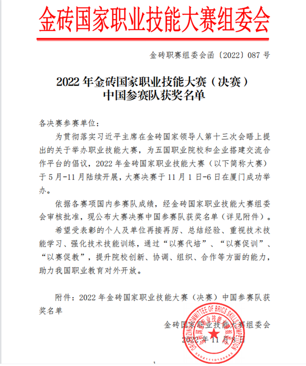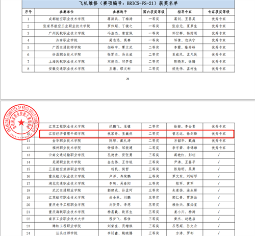 2022年金砖国家职业技能大赛(决赛)于11月1日至6日在厦门国际会展中心举行,经过几天激烈的比拼,大赛结果于11月8日正式揭晓,我校飞行技术学院教师祝家奇和王巍然组成的参赛队以该大赛“飞机维修赛项”区域选拔赛江西省第一名的成绩参加全国总决赛,荣获决赛“全国二等奖”的好成绩,同时徐剑锋和曾志远获得“优秀专家”称号。