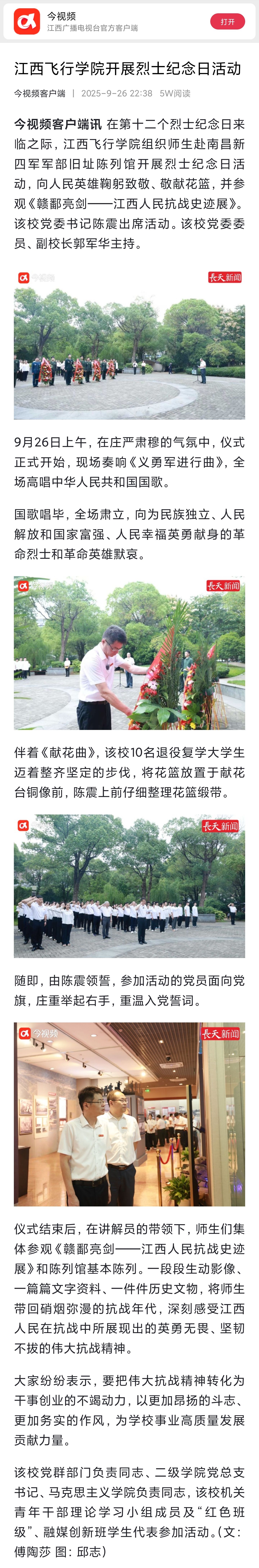 近日,今视频报道,江西飞行学院开展烈士纪念日活动详情如下:
