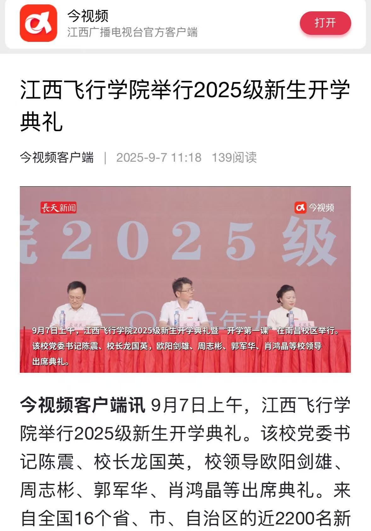 近日,今视频报道江西飞行学院举行2025级新生开学典礼详情如下: