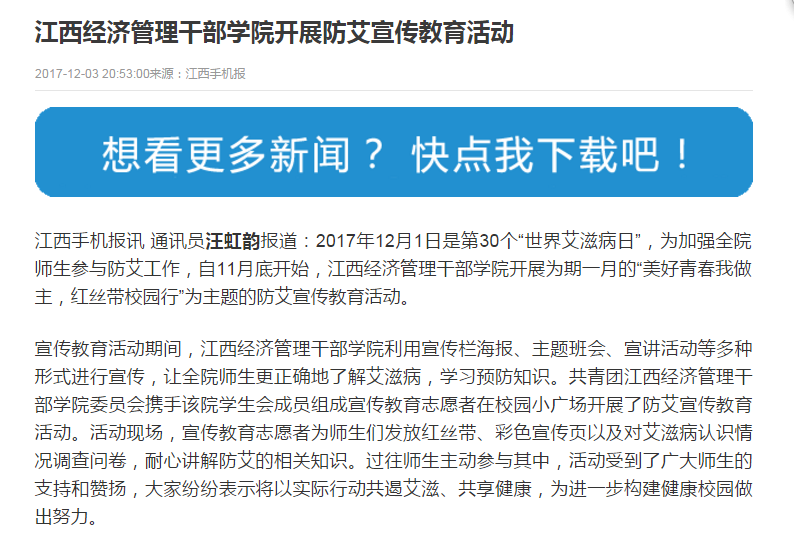 近日,江西手机报报道学院开展防艾宣传教育活动,以下为链接地址: http://zhibo.4g.jxnews.com.cn/v4/4gnews_825460_10101_55.html