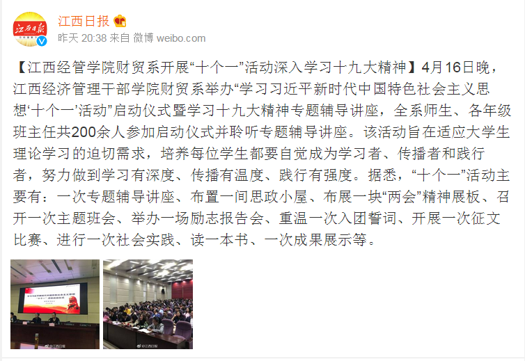4月16日晚,江西日报微博直播财贸系“学习习近平新时代中国特色社会主义思想‘十个一’活动”启动仪式暨学习十九大精神专题辅导讲座,链接如下: