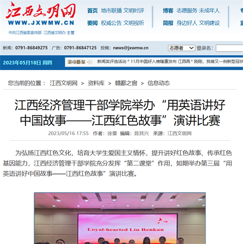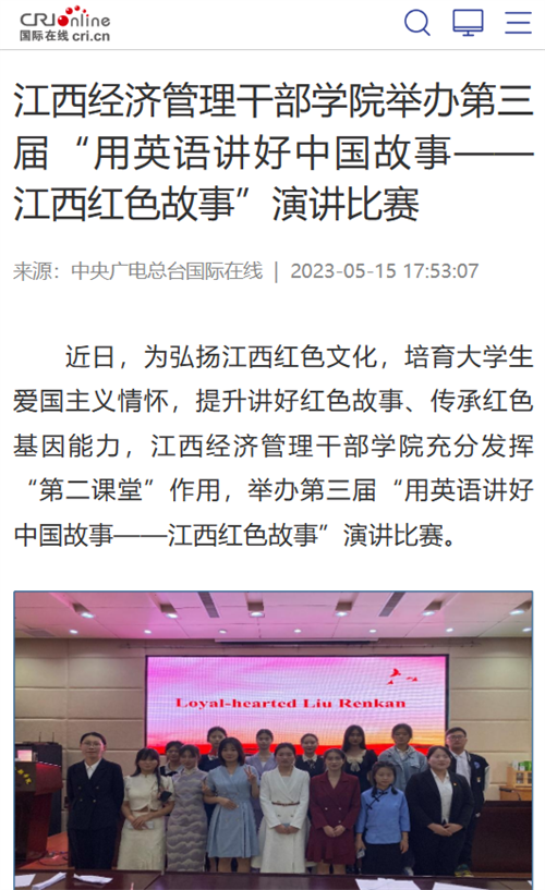 近日,多家媒体报道,学校充分发挥“第二课堂”作用,举办第三届“用英语讲好中国故事——江西红色故事”演讲比赛。详情如下:
