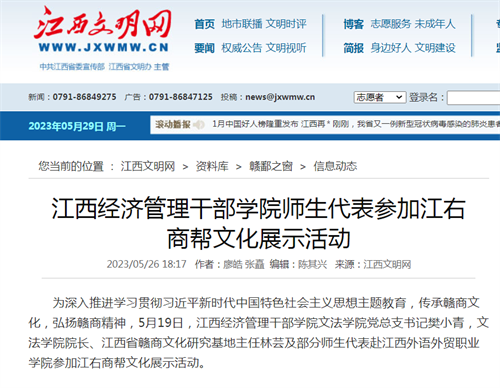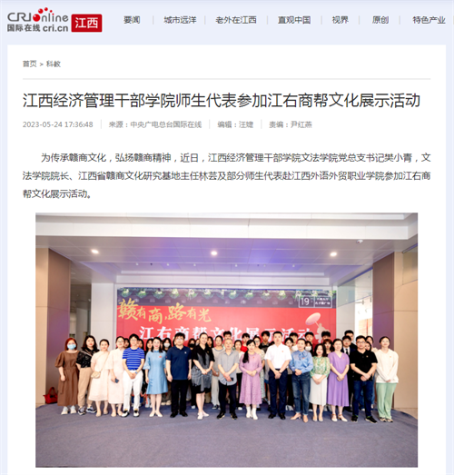 近日,多家媒体报道,学校师生代表赴江西外语外贸职业学院参加江右商帮文化展示活动。详情如下: