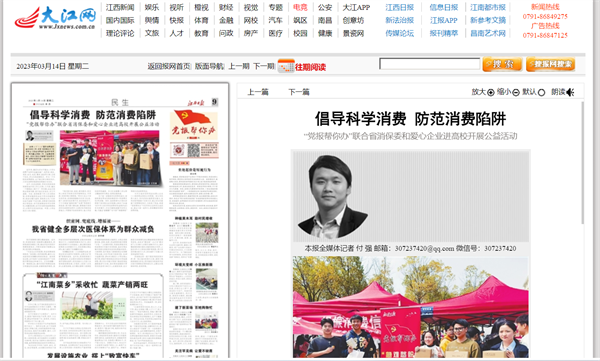 3月14日,江西日报第九版刊登,我校开展“消费教育进校园”公益活动,详情如下: http://epaper.jxxw.com.cn/html/2023-03/14/content_5411_7435842.htm