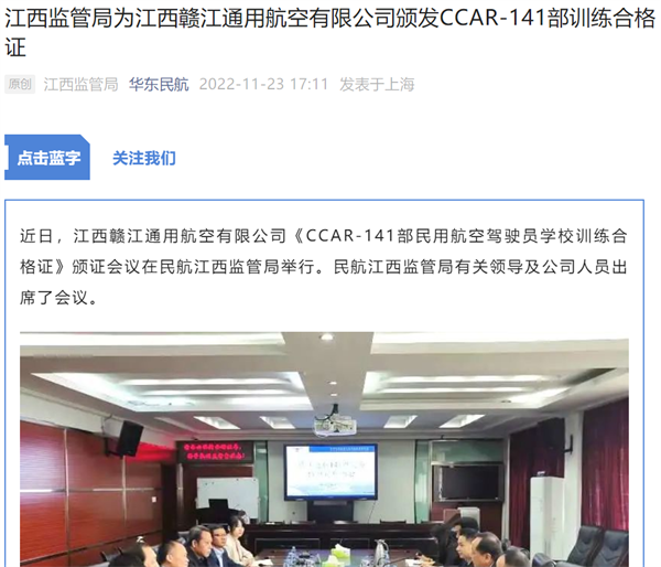 近日,江西赣江通用航空有限公司《CCAR-141部民用航空驾驶员学校训练合格证》颁证会议在民航江西监管局举行。详情如下: