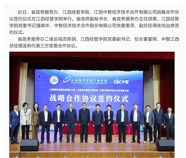 近日,省政务服务办、江西中智经济技术合作有限公司与我校的战略合作协议签约仪式在我校举行。详情如下: