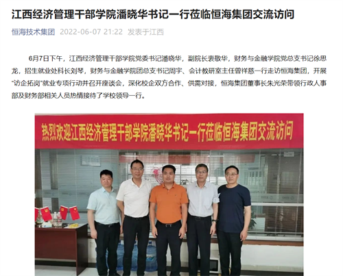 6月7日,恒海技术集团报道我校潘晓华书记一行莅临恒海集团交流访问,详情如下: