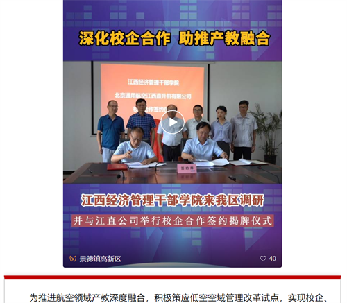 近日,景德镇高新区报道我校党委委员、副院长熊运儿一行来高新区调研,并与北京通用航空江西直升机有限公司举行校企合作签约揭牌仪式。详情如下: