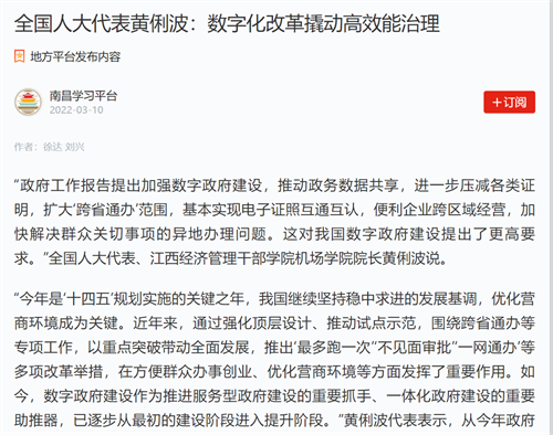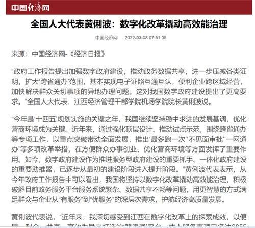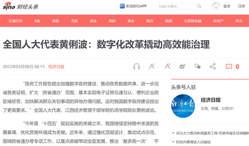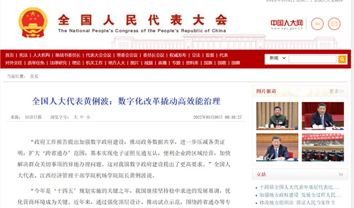近日,多家媒体报道全国人大代表、学校机场学院院长黄俐波:数字化改革撬动高效能治理,详情如下: