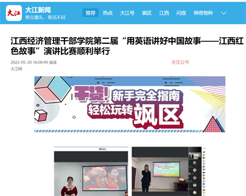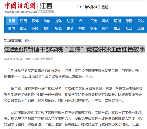 近日,多家媒体报道我校第二届“用英语讲好中国故事——江西红色故事”演讲比赛,详情如下: